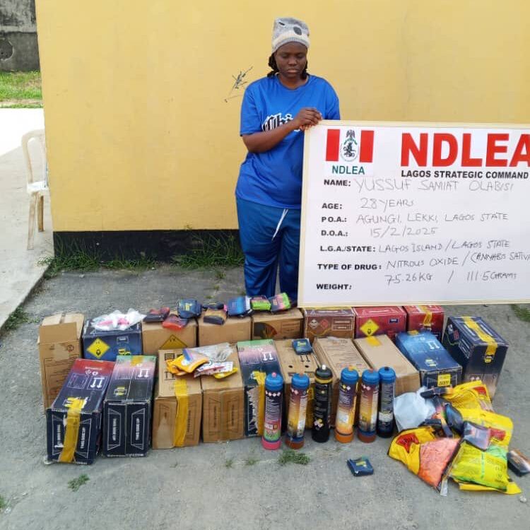 In Lagos, 28-year-old Samiat Olabisi Yussuf was on Saturday 15th February arrested by operatives during a raid of her Lekki home where 169.5 litres of nitrous oxide popularly known as laughing gas and 111grams of Loud were recovered. Not less than 132.84 kilograms of skunk were recovered from two suspects: Ibrahim Usman, 40, and Solomon James, 40, in Taraba. While Usman was nabbed with 88kg of Arizona and Ghana Loud at Wukari, James was arrested with 44.84kg of same substance at Takanaba, Sabongari, in Jalingo LGA.